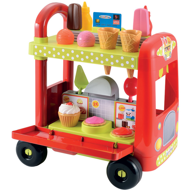 Ga op pad met jouw eigen rijdende winkel en verkoop ijsjes en hamburgers. Met deze handige rijdende winkel ben jij van alle markten thuis. Pinnen of contant? Het kan allebei! Het rijdende speelgoed winkeltje wordt geleverd inclusief accessoires.