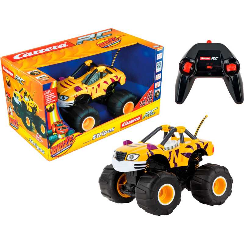 Ontdek nu het ultieme avontuur met Stripes! De op afstand bestuurbare monstertruck in tijgerlook van Carrera RC inspireert kleine racers vanaf 4 jaar. Met zijn waarheidsgetrouwe ontwerp uit de populaire Nickelodeon-serie “Blaze and the Monster Machines” trekt Stripes ieders aandacht. Met storingsvrije 2,4 GHz-technologie en eenvoudige bediening kan Stripes in alle richtingen worden gestuurd. De koele LED-lampjes in de uitlaat zorgen voor indrukwekkende verlichting. Het robuuste 1:18-model met ophanging en luchtbanden overwint moeiteloos elk klein obstakel. Koop nu dit ideale cadeau voor jongens, meisjes en alle Blaze/Strepen fans!