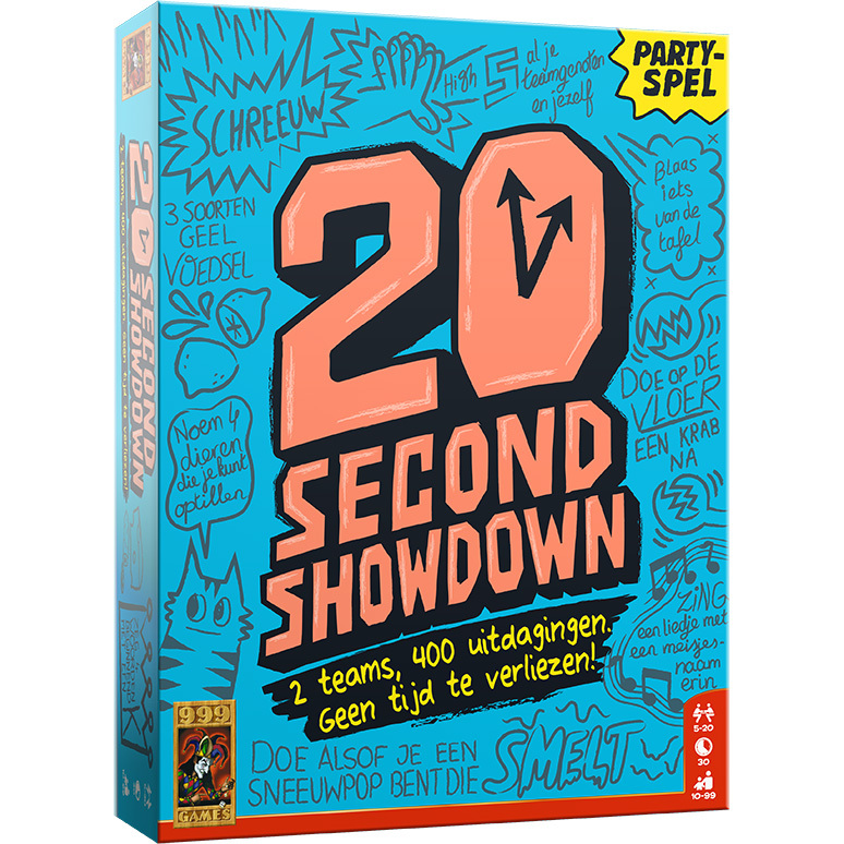 2 teams, 400 uitdagingen. Geen tijd te verliezen! In dit doldwaze partyspel vol belachelijk hilarische uitdagingen probeer je als team zo snel mogelijk opdrachten te vervullen om ervoor te zorgen dat het andere team “geen zand” meer heeft. Het eerste team dat 3 rondes wint, wordt tot 20 Second Showdown-kampioen gekroond. 20 Second Showdown is een vliegensvlug spel voor 5-20 spelers. Eén speler is de scheidsrechter. De anderen verdelen zich over twee teams, gaan tegenover elkaar zitten en zetten zich schrap. Aan het begin van elke ronde zet de scheidsrechter de zandloper terug met een gelijkmatige hoeveelheid zand in elke helft. De scheidsrechter draait de zandloper om en leest de kaart voor. Elke kaart bevat 2 uitdagingen en de scheidsrechter bepaalt welke kant in een ronde wordt gebruikt. “Sta op en doe de YMCA. Stel jezelf netjes voor zonder je mond dicht te doen. Noem drie landen die beginnen met de letter B. Gebruik je eigen sok als handpop. Noem alle dingen op die je vandaag hebt gegeten”. Bij iedere behaalde uitdaging draait de scheidsrechter de zandloper om. Om te winnen, moet je het andere team dwingen om zonder zand te zitten door je uitdagingen zo snel mogelijk af te ronden. Het eerste team dat zonder zand komt te zitten, verliest de ronde en het eerste team dat drie ronden wint, wordt gekroond tot kampioen!