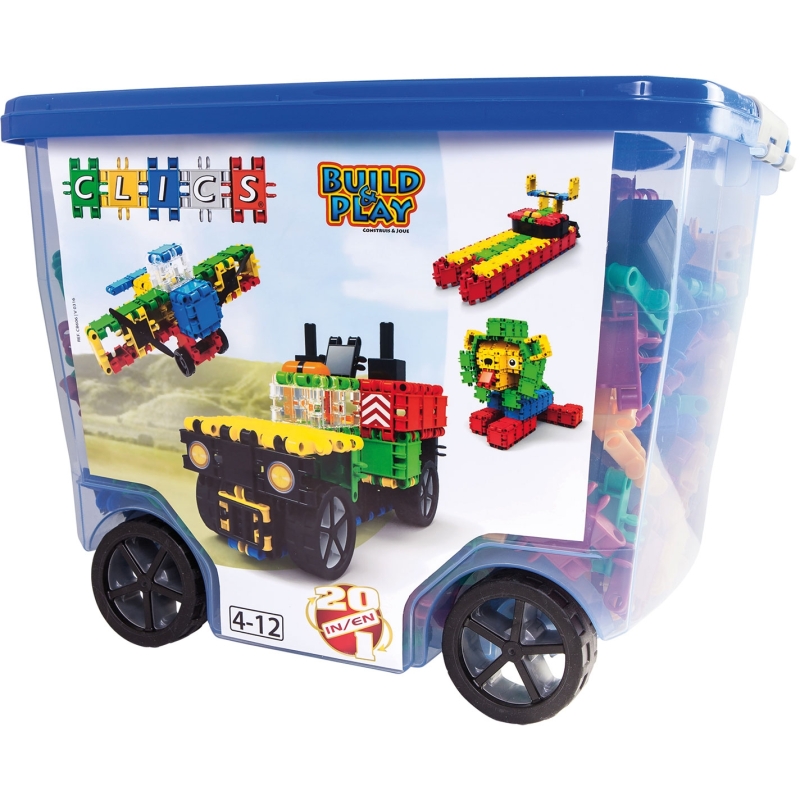 Elk kind houdt van fun speelgoed. En dat zit gewoon verpakt in de Rollerbox 20 in 1. Een box vol bouwpret die barst van de bouwstenen en de inspiratie. Want omdat bouwblokken en bouwplannen samengaan, vind je in deze verpakking 463 Clics, 97 accessoires en stickers, maar ook 20 bouwplannen. Daarmee bouw je een eigen racewagenpark of een stoere truck of bus. Ben je een waterrat? Dan zal de jetski ongetwijfeld je favoriet zijn. Maar pas op voor de krokodil, de dino of de leeuw, want die loeren om de hoek.