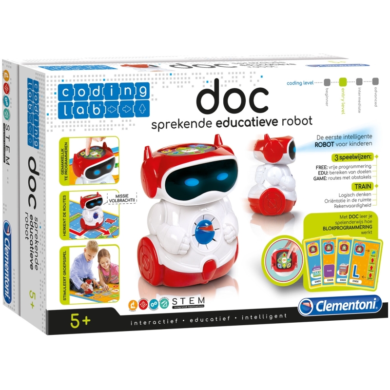 DOC helpt kinderen bij het leren: – helpt bij de ontwikkeling van het logisch denkvermogen en probleemoplossende vaardigheden; – leert kinderen letters, cijfers, kleuren en dierennamen.Met de robot leren ze spelenderwijs opdrachten programmeren. DOC is het allereerste spel dat kinderen op een leuke en creatieve manier in aanraking brengt met educatieve robotica.De robot kan worden geprogrammeerd om vrij rond te rijden of de voorgeprogrammeerde routes op de spelkaarten te volgen. Dit ondersteunt de ontwikkeling van de logische en probleemoplossende vaardigheden van kinderen.Wanneer de robot in ‘slimme’ modus wordt gebruikt, herkent hij zijn plaats op het spelbord en geeft hij het kind suggesties om het spel te spelen.