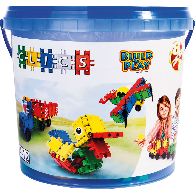 Hou je van bouwen met blokken? Dan zal je dol zijn op Clics. Want met de Clics bouwstenen bouw je je eigen wereld of die van de gratis meegeleverde bouwplannen. En omdat je ergens moet beginnen, stelde Clics dit starterspakket samen. Het bevat alles wat je nodig hebt om creatief aan de slag te gaan met bouwblokken. De sterkte van deze bouwemmer? Dat je er zowel een vliegtuig, een hond, een trein of een eendje mee kan bouwen en natuurlijk ook alles wat je zelf verzint. Want met 122 Clics, 38 accessoires en de knappe stickers, kom je echt een heel eind! Waarschuwing: dit speelgoed is niet geschikt voor kinderen onder de drie jaar i.v.m. kleine onderdelen.