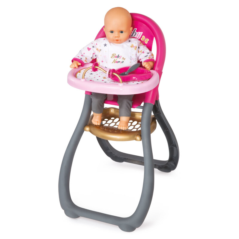 Heeft je pop honger? Zet haar dan in deze Smoby poppenstoel en verwen haar met haar lievelingseten! Door de brede opening kan de pop eenvoudig in de stoel gezet worden. Op het eetblad staat het bordje met lepeltje al klaar. Tijdens het wachten op het eten hoeft je pop zich zeker niet te vervelen, want de stoel is voorzien van leuk speelgoed. Onder de stoel is een opbergruimte aanwezig waar je verschillende accessoires kunt opbergen. De poppenstoel is gemaakt van kunststof en is gemakkelijk te verplaatsen. Als er wordt geknoeid, is dat geen probleem; hij is snel schoongemaakt. De speciale constructie zorgt voor een goede stabiliteit. Geschikt voor poppen tot 42 cm. Exclusief pop.