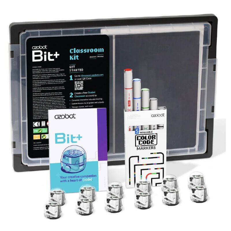 De Ozobot Bit+ Klassenset (12) is een compleet en direct in te zetten set, geschikt voor zowel de onderbouw als bovenbouw om te starten met programmeren. Alle materialen voor zowel de leerkracht als de leerlingen zijn inbegrepen, waaronder een fysieke Nederlandstalige lerarengids, evenals snelle toegang tot al onze gratis Nederlandstalige Ozobot lesmaterialen en activiteiten. Wat kun je verwachten van deze set? – Een complete Ozobot programmeer oplossing voor zelfstandig en groepsgewijs lesgeven. – Uitstekende en uitgebreide lesdocumentatie ter introductie van programmeeronderwijs in het basisonderwijs vanaf groep 3 t/m 8. – Direct implementeerbaar, gratis lesmateriaal, geen extra kosten. Inclusief complete lesmap De lesmap bestaat uit een uitgebreide lerarengids (waarin elk aspect eenvoudig en duidelijk wordt uitgelegd), leskaarten en antwoordkaarten. Alles gebundeld in één map. Alle lessen en documenten zijn ook gratis online te downloaden. Ontmoet de Bit+ Ontdek educatief robotspeelgoed voor kinderen vanaf 6 jaar. Ozobot combineert programmeren en robotica met talloze gratis lessen en activiteiten. Ozobot voorziet in alle aspecten om op een spelenderwijze manier kennis te maken met programmeren, zowel thuis als klassikaal. Programmeer Ozobot op 2 manieren; digitaal met OzoBlockly en ‘schermloos’ met stiften op papier. De instap is laagdrempelig, de leercurve is enorm. De programmeer functies die Bit+ te bieden heeft zijn eenvoudig te leren maar oneindig uitbreidbaar. De OzoBlockly web-based software en de vele lessen en activiteiten zijn volledig gratis en direct te gebruiken. De Ozobot Bit+ is voorzien van slimme sensoren (gepatenteerd). – Optische lijnsensoren om automatisch lijnen te herkennen en te volgen. – Optische kleursensor om kleuren en kleurcodes te herkennen. – Ook beschikt Bit+ over 1 LED, welke geprogrammeerd kan worden. – Aan-/uit-schakelaar om de levensduur van de batterij te maximaliseren. Het programmeren en besturen van de Bit+ kan op meerdere manieren. – De Bit+ kan ‘schermloos’ geprogrammeerd worden door het tekenen van lijnen en kleurcodes met stiften op papier. – De Bit+ kan digitaal geprogrammeerd worden met Ozoblockly (web-based). Twee manieren om te coderen Met kleurcodes Voor beginners: Teken lijnen en kleurcodes en plaats Ozobot op de lijn. Ozobot volgt nu de lijnen en zal reageren op de gekozen kleuren en kleurcodes. Met ozoblockly Met de gratis programmeertool Ozoblockly kan iedereen leren programmeren op verschillende niveau’s. Sleep blokjes aan elkaar en maak eenvoudig je eerste programmeercode. Ozobot Bit+ in de klas De Bit+ is een toegankelijke robot voor klassikaal gebruik i.c.m. een PC, tablet of op papier. Dankzij het uitgebreide aanbod van gratis lesmateriaal kan je direct aan de slag. Alle materialen voor zowel de leerkracht als de leerlingen zijn inbegrepen, waaronder een fysieke Nederlandstalige lerarengids, evenals snelle toegang tot al onze gratis Nederlandstalige Ozobot lesmaterialen en activiteiten.