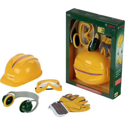 Leer je kind over veiligheid bij het klussen met de Bosch speelgoed veiligheidsset van Theo Klein. De set bestaat uit een bouwhelm, een set handschoenen, gehoorbescherming en een veiligheidsbril.