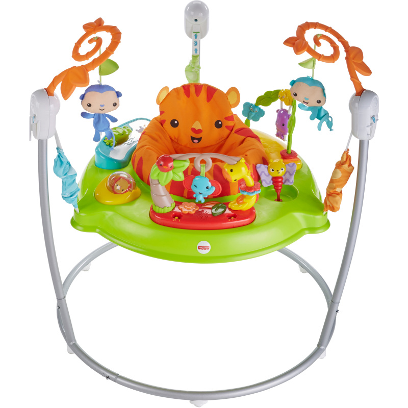 Er is voor je baby een heleboel te ontdekken aan deze jumperoo met regenwoudvriendjes. En je baby wordt bij iedere sprong beloond met muziek, lichtjes en leuke geluidjes! Met de draaistoel kan je baby overal bij: bij de speeltjes, de activiteiten en de dieren, zoals de zachte aapjes boven zijn hoofd, de spinners, de klikkers, een kralensnoer, spiegeltje en nog veel meer. Met drie hoogtestanden kan het pakken, grijpen en springen gewoon doorgaan, ook al groeit je kleine verkenner! Uitsluitend gebruiken wanneer je kleintje zijn hoofdje zonder hulp rechtop kan houden en niet uit het speelgoed kan klimmen.