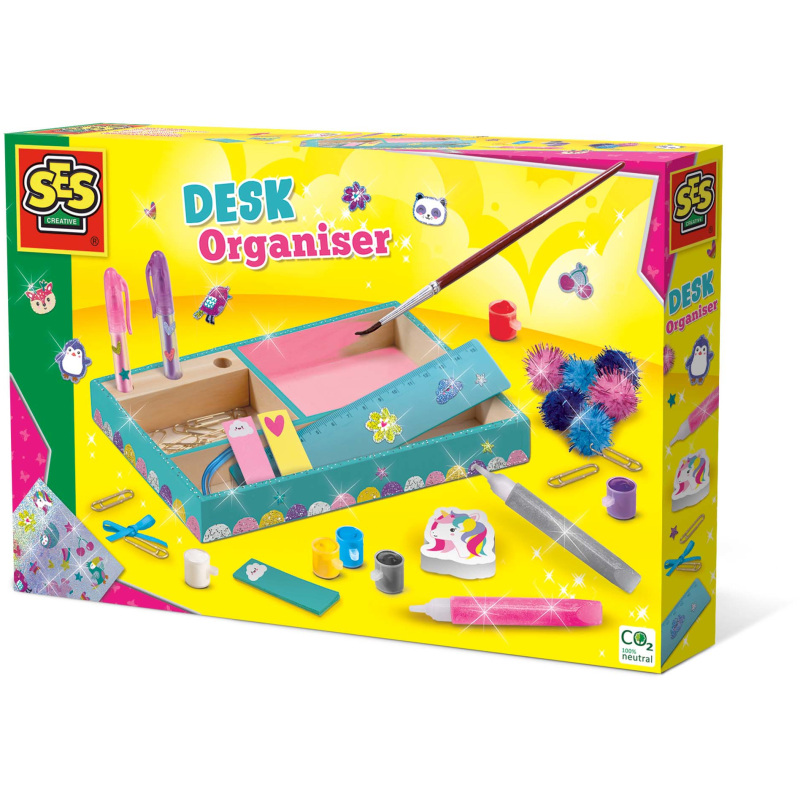 Een echt houten bureau-organizer met handige vakjes om zelf te schilderen en te versieren. Daarnaast bevat deze set ook alle accessoires, zoals twee gelpennen, paperclips om te versieren, kleefnotities, unicorn gum en een liniaal. Ga dus lekker aan de slag met de zes kleuren verf, glitterlijm, glitter stickers, pompons en meer! Maak je eigen unieke bureau-organizer en bewaar je spulletjes handig op één plek.