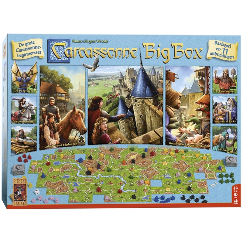 Carcassonnepakket met het basisspel Carcassonne van 999 Games en maar liefst 11 uitbreidingen in het nieuwe artwork! Hiermee kan je oneindig variëren. Het speelmateriaal past praktisch in de doos, waardoor je alles altijd gemakkelijk bij de hand hebt. Wat zit er precies in? Het basisspel Kathedralen & Herbergen Kooplieden & Bouwmeesters De Abt De Rivier De Vliegtuigen De Veerboten Nieuwsberichten De Goudmijnen Tovenaar & Heks De Rovers De Graancirkels