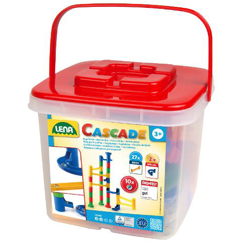 Deze LENA Cascade knikkerbaan bestaat uit 29 railelementen en 10 glazen knikkers. De variatie in bouwmogelijkheden van de knikkerbaan bevordert motoriek en logisch denken.