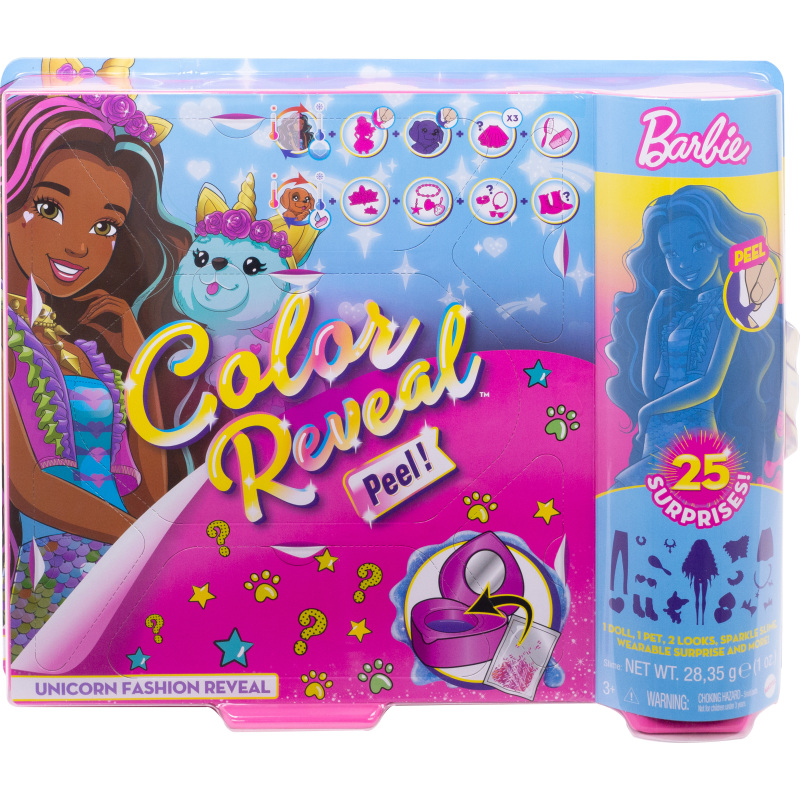Barbie Color Reveal poppen zorgen voor de ultieme uitpakervaring: deze set bevat 25 verrassingen, waaronder 4 herhaalbare kleurveranderingen, een puppy als huisdier, twee fantastische eenhoorn-outfits, glitter en slijm in een hartvormig zakspiegeltje, een Barbie pop en een armbandje met bedeltjes in kindermaat en een sticker! Speel steeds opnieuw met je favoriete fantasietransformaties. De verpakking is ook een deel van de pret: open de 16 suprisetasjes door de vakjes open te pellen. Een van de surprisetasjes bevat een Kleurverrassing pop die gedeeltelijk is bedekt met een paarse, pelbare laag. Kinderen moeten die laag pellen om de pop te onthullen. Vervolgens kunnen ze ook nog de surprisetasjes openen om kleding en accessoires te ontdekken voor twee complete, op eenhoorns geïnspireerde looks! En de verrassingen blijven maar komen… je moet ook pellen om de puppy te onthullen! Dompel de hartvormige spons in ijskoud water om de kleurveranderingen te activeren. Probeer het bijvoorbeeld op het gezicht, topje en haar van de pop! Kleurverandering op het kopje van het huisdier draagt bij aan het surpriseplezier! Met warm en koud water kun je deze spectaculaire kleuren steeds opnieuw veranderen! Met zo veel verrassingen en accessoires kun je eindeloos veel verhalen bedenken. Welke pop heb jij? Verzamel ze allemaal en verwissel de accessoires, zo kun je eindeloos veel verhalen bedenken!