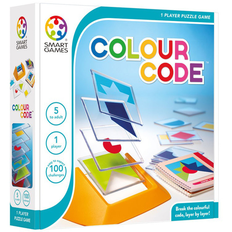 Kraak de code laag per laag! Kies één van de 100 opdrachten en bouw deze na door de juiste plaatjes te combineren. Dit spel lijkt eenvoudig, maar toch is het resultaat telkens weer verrassend voor kinderen én volwassenen! 18 doorzichtige plaatjes met vrolijk gekleurde vormen, handige houder, boekje met opdrachten en oplossingen. Spelregels – Stap 1: Leg de 18 plaatjes naast de houder en kies één van de 100 opdrachten uit het boekje. – Stap 2: Kies de plaatjes die je denkt nodig te hebben en leg ze op elkaar in de houder. – Stap 3: Wanneer je resultaat helemaal overeenkomt met de afbeelding in de opdracht, dan heb je de puzzel opgelost!
