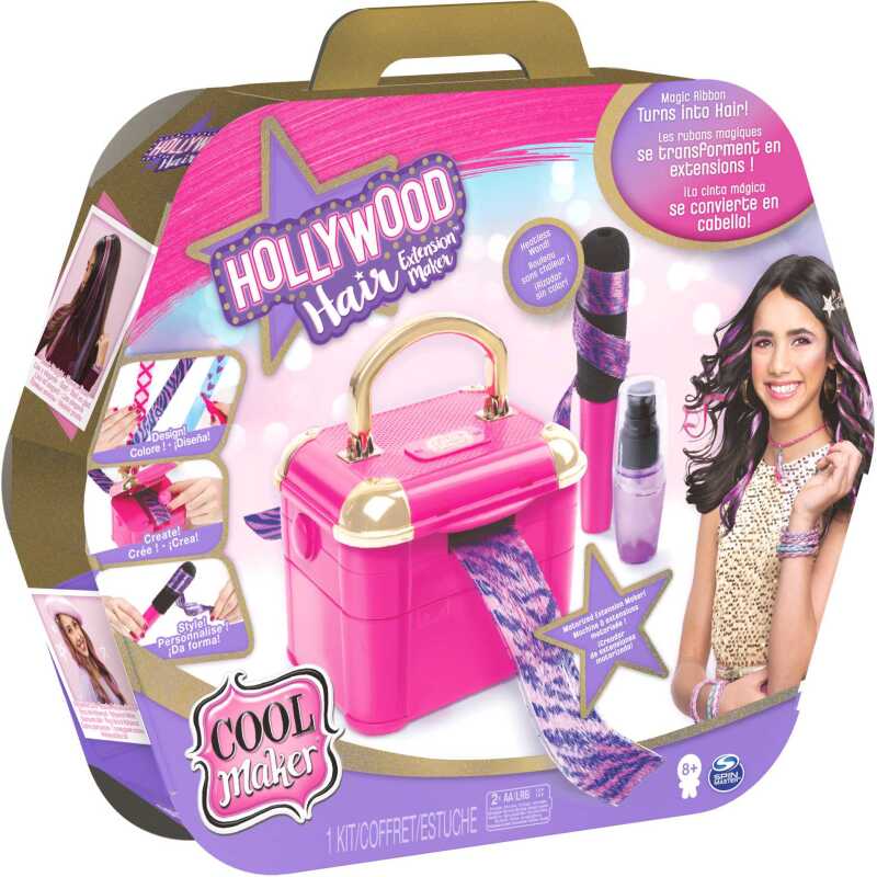 Ontwerp en creëer je eigen haarextensions met de Cool Maker Hollywood Hair Extension Maker. Deze DIY-studio wordt geleverd met alles wat je nodig hebt om 12 haarextensions, die je echt kunt dragen, helemaal aan je eigen smaak en stijl aan te passen. Het is leuk en eenvoudig om kapsels te creëren met de Hollywood Hair Extension Maker. Kies een haarlint met een leuk kleur of patroon, ontwerp het op elke gewenste manier met de meegeleverde markeerstiften en plaats het lint in de machine. Druk op de knop en de gemotoriseerde Hollywood Hair Extension Maker transformeert je haarlint op magische wijze in een superschattige haarextension die je echt kunt dragen. Vervolgens kun je je extension op je eigen manier stylen. Met een hitteloze krultang en twee hulpstukken kun je talloze stijlen maken die op elke foto de show stelen. Vul de spuitfles met water en spuit je haar nat voor strakke krullen, losse zomerse golven, glamoureuze Hollywood-krullen of een strakke en steile look. Voeg een haarclip toe en draag je trendy haarextension, en maak nog meer stijlen die je met je vriendenclub kunt delen. Als je klaar bent met stylen, kun je alles eenvoudig opbergen in de onderkant van de machine. Wil je nog meer unieke kapsels creëren, zoals een kroonvlecht, dubbele knotjes en meer? Kies dan de Hollywood Hair Party Pop- en Starstruck (elk afzonderlijk verkocht). Personaliseer je look van top tot teen met de Cool Maker Hollywood Hair Extension Maker, 2-in-1 KumiKreator en Go Glam Nail Salon (elk afzonderlijk verkocht). Breng de salon bij je thuis en creëer eindeloze looks met de Cool Maker Hollywood Hair Extension Maker.