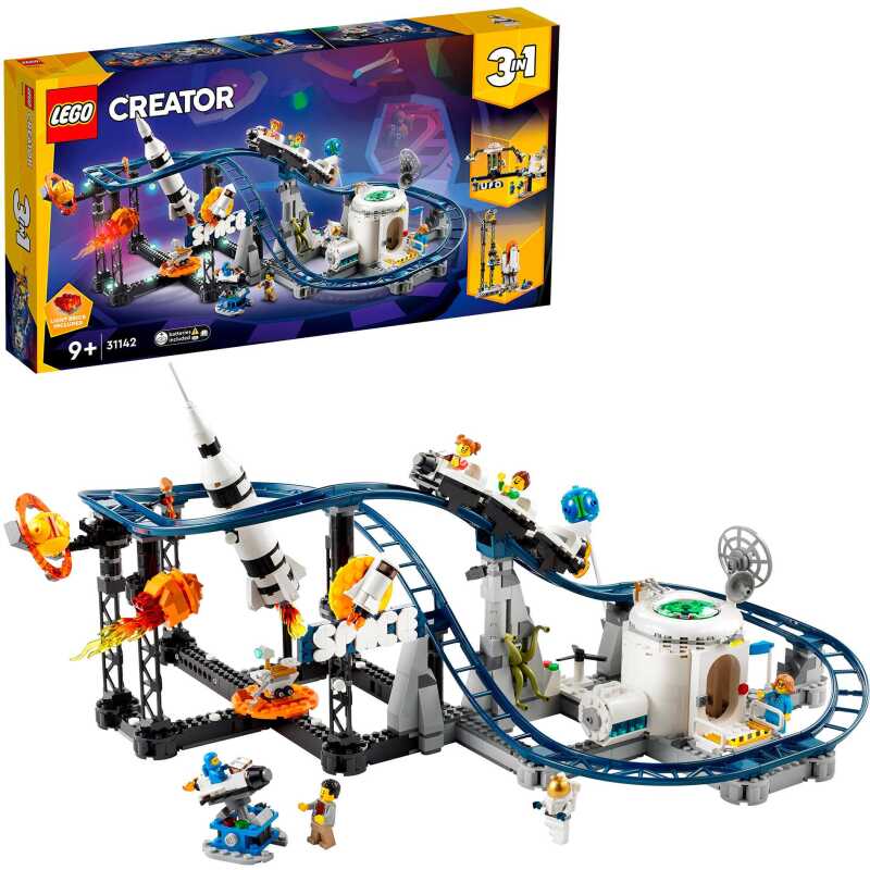 Creëer een ruimte-avonturenpark met deze 3-in-1 set uit de LEGO Creator-serie. De bochtige achtbaan met 3 bewegende auto’s gaat langs een ruimteraket, modellen van Saturnus en Aarde, een maanbasis en een vallende ster. Er is ook een meteoor en 5 minifiguren (een vader en 2 kinderen, een wetenschapper en een baby-astronaut). Maar dat is nog niet alles, want de ruimteachtbaan kan ook worden omgebouwd tot een vrijevaltoren met lift of tot een draaimolen. Elk model kan worden verlicht door de bijgeleverde lichtsteen die kan worden ingeschakeld. De outfits van de minifiguren kunnen worden veranderd.