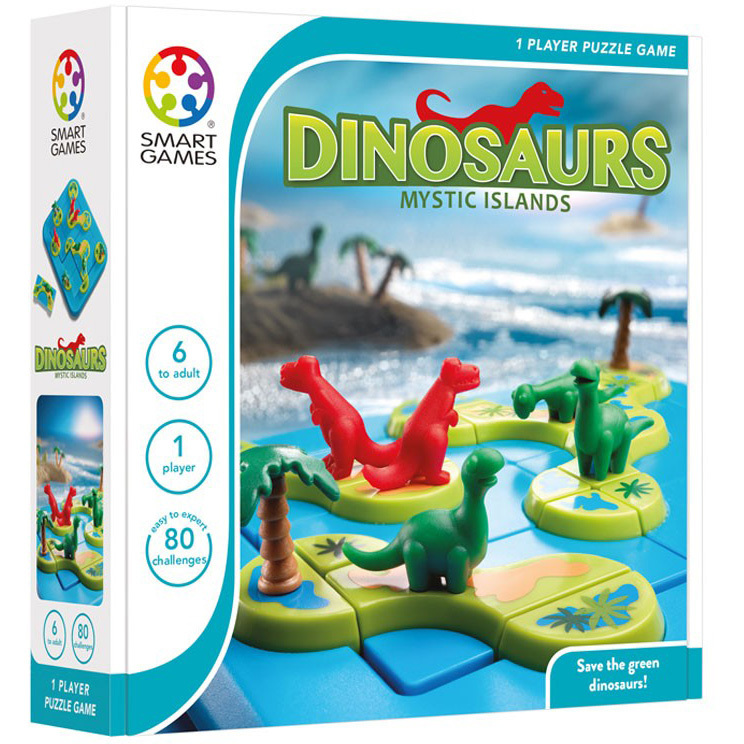 Plaats de eilanden en red zo de groene dinos in Dinosaurs – Mystic Islands van SmartGames! Blijf geconcentreerd en herbeleef het Jura-tijdperk. Dinosaurs: Mystic Islands is een fascinerend spel waarin je de puzzelstukken met de eilanden zo moet plaatsen dat de groene planteneters niet samen staan met de rode vleeseters. Kan je de 80 opdrachten aan en slaag je erin de lieve dino’s te redden van de T-rex’en?