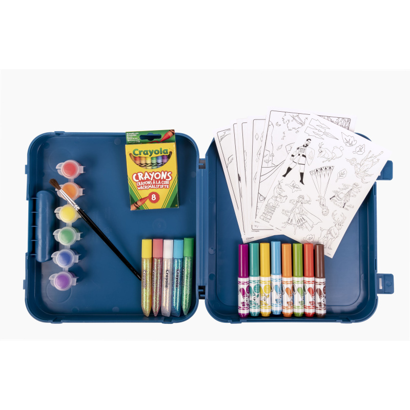 Creëer en kleur met deze complete Crayola kleur- en knutselset van Frozen 2! Kleur, decoreer en versier kleurplaten van Elsa, Anna, Olaf en andere Frozen 2 karakters. Deze complete set bevat 8 kleuren waterverf, 1 verfpenseel, 8 metallic waskrijtjes, 3 glitterlijm tubes, 10 Frozen 2 kleurplaten, 30 gekleurde papieren, 1 inkleurbaar stickervel, 1 stickervel. Houd alle creatieve spulletjes georganiseerd in de mooie kleurkoffer. Makkelijk op te bergen en ook heel eenvoudig om mee te nemen. Perfect dus voor onderweg! Een fantastisch cadeau voor alle fans van de nieuwe Frozen 2 film. De inkt van de kleurartikelen is afwasbaar van huid en kleding.