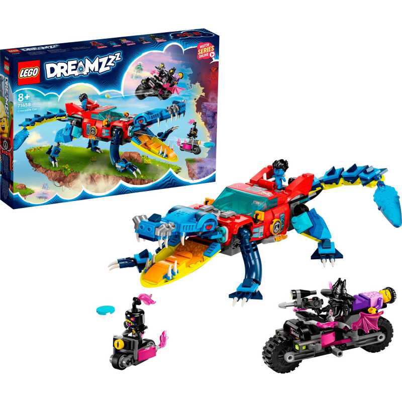 Laten we gaan – op topsnelheid in de droomwereld van LEGO DREAMZzz! Deze set is gebaseerd op de tv-serie en maakt een fantastische auto om Jayden te bevrijden uit de klauwen van de griezelige Nachtjager. Er zijn twee bouwopties: Ofwel de krokodilauto die nachtmerries kan wegjagen – of de supersnelle terreinwagen en miniboot die de nachtmerries achtervolgen. In de krokodilmodus heeft de auto verstelbare armen en benen en een verborgen schijfschieter in bek van de krokodil. In de vrachtwagenmodus heeft de auto rollende wielen en een afneembaar dak om een minifiguur in te plaatsen. Er worden 3 minifiguren meegeleverd: Cooper, Jayden en de Nachtjager.