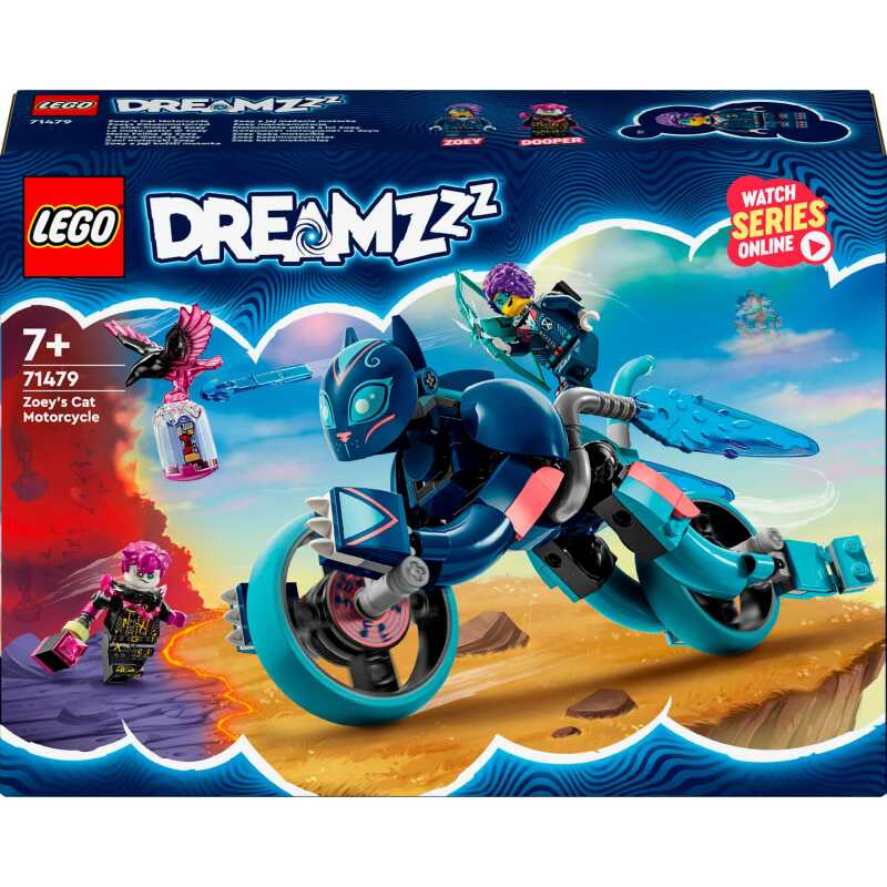 Breng de fantasie tot leven met dit LEGO® DREAMZzz™ Zoey’s kattenmotor (71479) speelgoed. Deze herbouwbare speelgoedkat voor kinderen is geïnspireerd op de spannende tv-serie en laat jongens en meisjes vanaf 7 jaar een rit maken naar de Droomwereld met een cool LEGO voertuig. De raaf van de Neder Heks heeft een herinnering gestolen en kinderen moeten Zoey helpen om die terug te vinden! Er zijn 2 bouwmogelijkheden: jonge dromers zullen het geweldig vinden om de verstelbare kattenfiguur in elkaar te zetten voordat ze hem transformeren tot een kattenmotor op wielen of een snelle speelgoedkat met turboboosters. Deze LEGO DREAMZzz set stimuleert de creativiteit en wordt tot leven gebracht door 2 minifiguren, waaronder Zoey, die aan de achterkant van het kattenmodel kan worden bevestigd en wordt geleverd met een boogaccessoire dat echt kan schieten. De set bevat bouwinstructies op basis van verhalen, zodat kinderen helden kunnen worden in de Droomwereld waar ze 2 avonturen beleven.