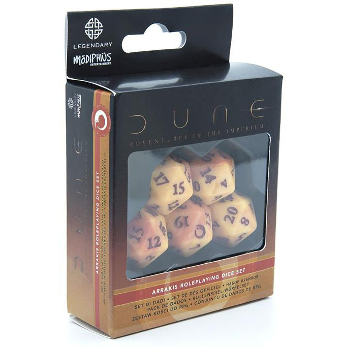 Een prachtige set zandkleurige dobbelstenen, die de kracht van de Makers brengen naar jouw Dune Adventures in the Imperium spel. Het pakket bevat vijf twintig-zijdige dobbelstenen. Gekleurd in zandgeel met bruin gemarmerd gesteente en kaneelkleurige nummering. Elke dobbelsteen heeft een eigen symbool van Shai-Hulud op één zijde.