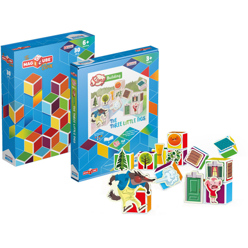De Geomag Education Story Building – Three Little Pigs bundel is een interactieve bundel diebestaat uit een Magicube doos en een verhaaldoos. Het Geomag Education project heeft originele activiteiten ontwikkeld met producten gericht op een brede leeftijdsgroep, met als doel positief leren aan te moedigen en te versterken. Met deze set kan je eindeloos 3D-structuren bouwen, dankzij de magische krachten van het magnetisme, waardoor je al spelend creativiteit en fantasie kunt ontketenen. De magnetische staven, stalen bollen en panelen met verschillende vormen vormen vormen het magnetische bouwsysteem dat het merk over de hele wereld beroemd heeft gemaakt; De Magicube Doos: Deze Geomag Education set van 30 Magicube kubussen vormt de basis van de educatieve bouwprojecten. De magnetische kubussen stimuleren de creativiteit en behendigheid door middel van 3D-constructie. Om de spelactiviteiten uit te breiden kunnen de Verhaal-, Wiskunde- en Woordbouwkaartensets worden toegevoegd. Verhaal bouwen: De Story Building sets bevatten een rijk assortiment kaarten die magnetisch aan de kubussen kunnen worden bevestigd, zodat kinderen een verhaal kunnen bouwen onder begeleiding van een boek dat het plot en de scènes illustreert. Het boek geeft een voorbeeld van hoe men plezier kan beleven aan het bouwen met de kubussen en de kaarten, en stelt ook stimulerende vragen voor die aan de kinderen kunnen worden gesteld.