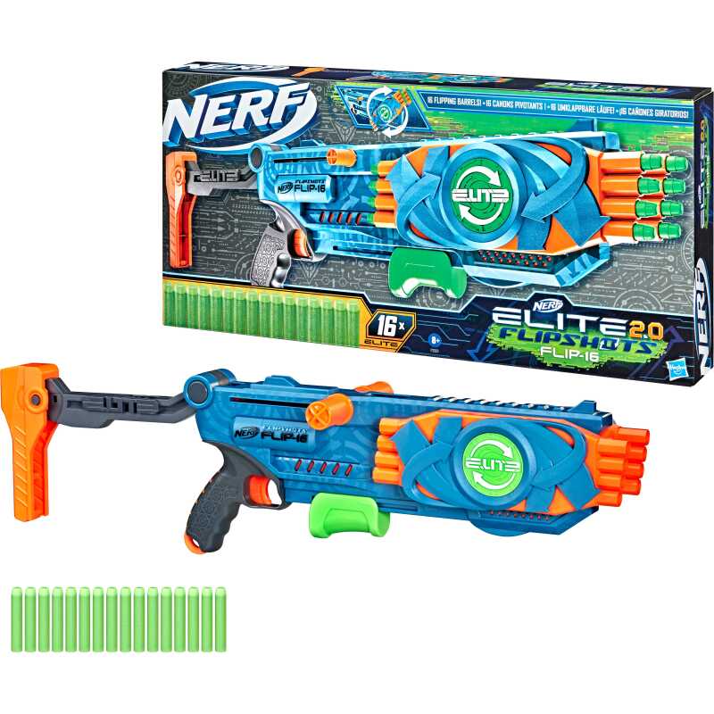 Gooi je in de strijd met de Nerf Elite 2.0 Flipshots Flip-16-blaster! De blaster heeft 16 lopen — 8 die naar voren zijn gericht en 8 die naar achteren zijn gericht. Vuur darts af van de 8 naar voren gerichte lopen en keer de 8 naar achteren gerichte lopen naar voren om darts te blijven afvuren. Net wanneer je tegenstanders denken dat het met je gedaan is, kan je ze verrassen met 8 extra geladen lopen! De rug-aan-rug lopen zijn verbonden om ze snel en makkelijk om te draaien wanneer je aan de hendel trekt. Vuur 1 of 2 darts per keer af! Haal de trekker half over om 1 dart af te vuren of helemaal om 2 darts weg te schieten. De blaster wordt doorgeladen met een grendel en heeft een schoudersteun die je kan gebruiken om nauwkeurig te mikken of kan inklappen en gebruiken als vizier. Elke loop bevat 1 dart en de blaster kan 16 darts bevatten. Inclusief 16 officiële Nerf Elite 2.0-schuimdarts. Het dragen van een bril is aanbevolen (niet inbegrepen). Handmatig aangedreven (geen batterijen nodig).