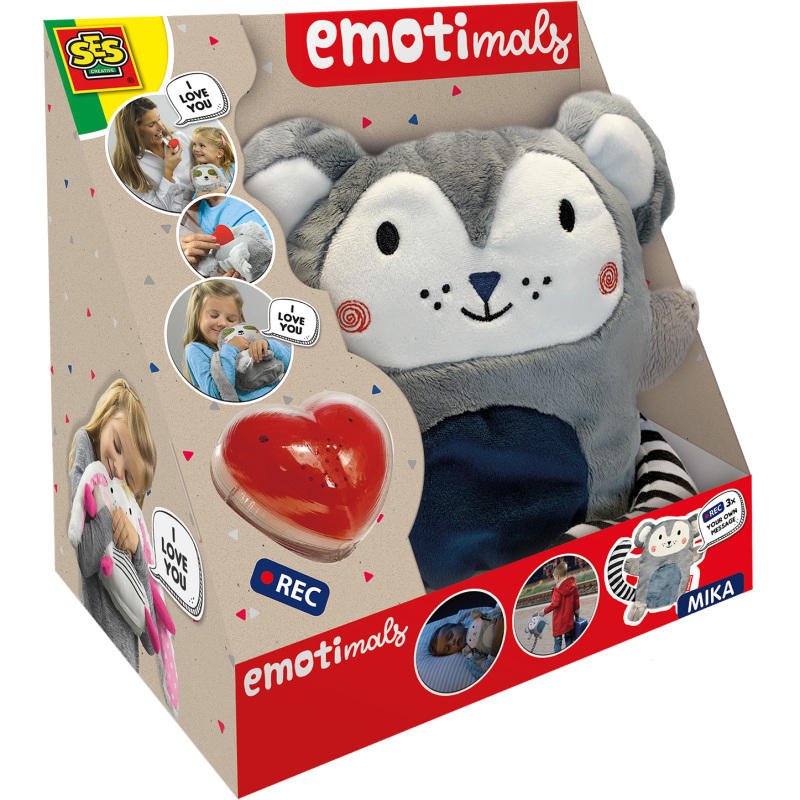Een SES Emotimals, zoals Mika, is meer dan een zachte knuffel met lange armen en een staart. Gaat je zoon of dochter voor het eerst naar de crèche, naar school of uit logeren? Toch een beetje spannend? Geen paniek! Emotimals hebben een groot hart, met ruimte voor drie lieve berichtjes die je zelf kan opnemen. Met een Emotimal is mama, papa, oma of opa altijd dichtbij! Alle Emotimals zijn gemaakt van stof met verschillende texturen, zodat ze heerlijk knuffelen. Door te schudden wordt één van de berichten afgespeeld. Met een lange staart en zachte vacht is er niks beters dan knuffelen met Mika. De ronde oren zijn perfect om mee te luisteren naar wat jij te vertellen hebt.