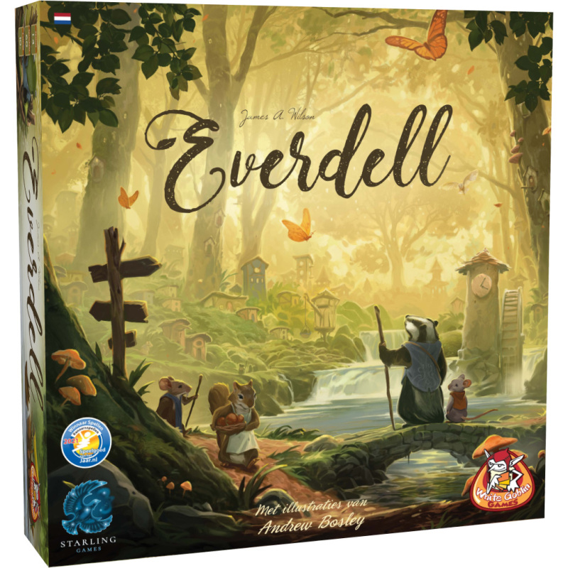 In de lieflijke vallei Everdell, onder de Evertree, groeit en bloeit een prachtige beschaving van boswezens. De Evertree neemt je mee door de verschillende seizoenen van het jaar. Het is tijd voor verdere ontwikkeling en jij bent hiervoor aangewezen! Verzamel bessen, stenen, hars en hout. Deze grondstoffen heb je nodig om je beschaving te laten groeien. Verwelkom de verschillende boswezens en laat je onderdompelen in de magische en wondere wereld van Everdell. In Everdell kan je op verschillende locaties je arbeiders op het speelbord plaatsen om grondstoffen of kaarten te verzamelen. Deze grondstoffen heb je nodig om boswezens en gebouwen in je stad te kunnen spelen. Je speelt in het spel vier seizoenen; lente, herfst, zomer en de winter. Na het laatste seizoen worden alle verzamelde punten opgeteld. Het spel eindigt wanneer niemand meer acties kan of wil uitvoeren. De speler die de beste stad bouwt en de meeste punten heeft verzameld, wint het spel. Everdell is een dynamisch bouw- en worker placement spel voor de hele familie. Het spel heeft een hoge herspeelbaarheid waardoor het spel elke keer weer anders verloopt. Ben je toe aan meer uitdaging? Bekijk dan ook eens de uitbreidingen Pearlbrook en Spirecrest.