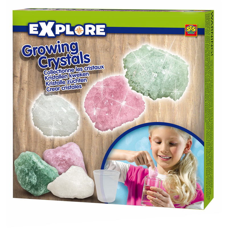 Met deze set laat je mooie kristallen groeien op drie verschillend gekleurde stenen. Mix het kristalpoeder met warm water en leg de stenen in dit mengsel. Na een paar minuten zullen de eerste kristallen zich gaan vormen! Onder de naam Explore brengt SES speelgoed rond de onderwerpen natuurverschijnselen, ontdekken en onderzoeken. Kristalvorming is een bijzonder natuurverschijnsel. Kristallen zijn prachtig om te zien en met Explore kun je nu zelf beleven hoe ze ontstaan.Eigenschappen: Je voegt zelf warm water toe aan het aluin in de doosMet de benodigdheden in elke doos kun je kristallen laten groeien op verschillend gekleurde stenenEen echt natuurlijk fenomeen dat normaal jaren duurt, kun je nu creëren in een paar dagenErg mooi om te zienMet duidelijke instructiesDe waarschuwingen op de achterzijde van de doos zijn verplicht, omdat het ontstaan van kristallen een chemische reactie is. Er zitten dus geen gevaarlijke stoffen in deze doos.