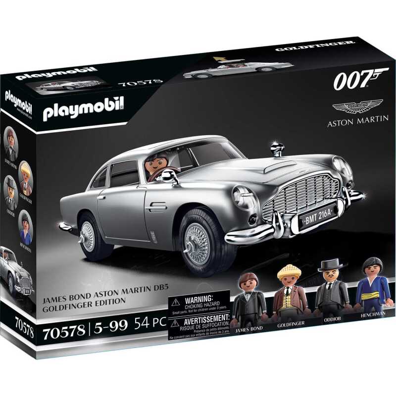 James Bonds Aston Martin DB5 van Goldfinger (1964) met authentieke snufjes zoals de passagier schietstoel en draaibare kentekenplaten. Met James Bond, Auric Goldfinger, Oddjob en een Goldfinger-handlanger. James Bond is ’s werelds beroemdste geheim agent. Al bijna zestig jaar houden de avonturen van 007 fans over de hele wereld in vervoering. Elke nieuwe opdracht is een avontuur boordevol actie, gevoed met geweldige stunts, adembenemende achtervolgingen en natuurlijk de nieuwste gadgets. In zijn derde optreden op het scherm in Goldfinger (1964) rijdt James Bond voor het eerst in de iconische Aston Martin DB5. Deze zilveren Aston Martin wordt geleverd met authentieke snufjes zoals draaibare kentekenplaten, een schietstoel voor de passagier en nog veel meer. In dit tijdloze voertuig jaagt 007 al zijn achtervolgers weg in een spectaculaire achtervolging en dwarsboomt vervolgens de plannen van schurk Auric Goldfinger. Deze PLAYMOBIL-set is een must-have voor alle Bond-fans!