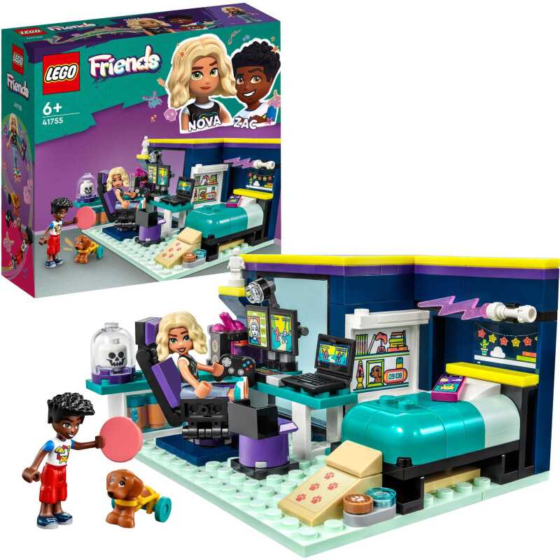 Klaar om te spelen? Nova’s kamer is gewijd aan haar liefde voor games. Maak kennis met Nova en Zac terwijl ze samen hun favoriete games spelen. Bekijk de gaming-pc met toetsenbord, neon ventilatoren, gamingstoel en microfoon. Als het tijd is voor een pauze, geniet dan van een drankje en een stripboek. Of ontspan je met Pickle de geredde hond. Hij heeft zijn eigen wielen, plus een helling om hem op het bed te helpen. Wat een blije pup! Kinderen vanaf 6 jaar kunnen veel ontdekken met deze LEGO Friends Nova’s kamer (41755) bouwset. Zac dacht dat hij niet veel gemeen had met Nova, totdat hij ontdekte dat ze van gamen houdt – net als hij! Nu kunnen ze hun vriendschap opbouwen terwijl ze samen spelen. Er is een gaming-pc met toetsenbord en neon ventilatoren, plus een gamingstoel en microfoon. Kinderen kunnen helpen met het verzorgen van Pickle, de geredde pup. Er is een werkbank waar Nova de wielen van Pickle kan repareren, plus een helling om hem op het bed te helpen. Leuke details zoals de verborgen poster onthullen Nova’s andere interesses. Inspireer jonge bouwers Kinderen kunnen genieten van een eenvoudig en intuïtief bouwavontuur met de LEGO Builder app. Hiermee kunnen ze inzoomen en hun modellen in 3D draaien, sets opslaan en hun voortgang bijhouden. Nieuwe inwoners van Heartlake City Kinderen kunnen vrienden maken, leuke locaties ontdekken en levensechte avonturen naspelen in het LEGO Friends universum.