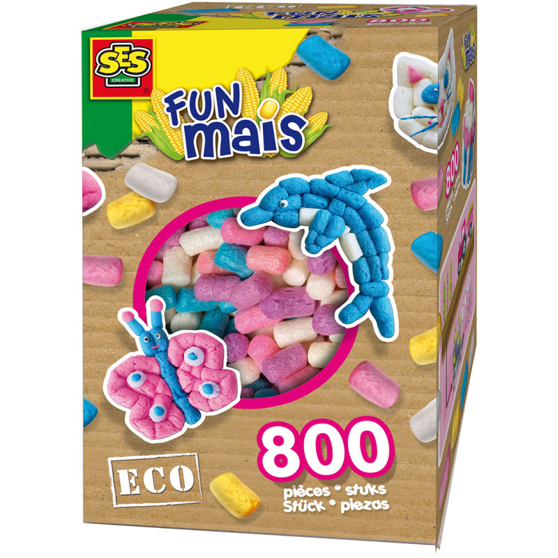 Een doos vol met gekleurde Funmais, waarmee je eindeloze variaties kunt maken. Plak de vlokken gemakkelijk aan elkaar met een beetje water. Welke creaties kun jij er allemaal mee maken? Funmais is gemaakt van echte maïs. Met water worden ze kleverig. Geen lijm nodig. Met Funmais van SES creëer je de mooiste figuren. Door de bouwsteentjes nat te maken kun je ze aan elkaar plakken. Een doos met 800 Funmaisvlokken Maak eindeloze creaties met Funmais Plak de stukjes gemakkelijk aan elkaar met een beetje water Funmais is gemaakt van echte maïs Funmais is gemakkelijk te snijden met het bijgeleverde mesje Zelfs het mesje is gemaakt van echte maïs Maïsproducten zijn biologisch afbreekbaar Leerzaam en educatief speelgoed Ontwikkelen 2D en 3D vaardigheden Bevorderen van ouder-kind interactie Heldere kleuren Stimuleren creativiteit en zelfvertrouwen Funmais knutselt schoon