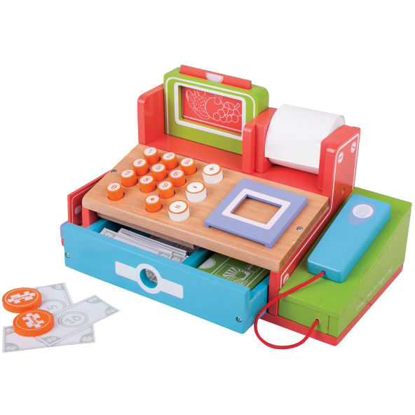 Houten speelgoed kassa met scanner, speelgeld en creditcard. De kassa is voorzien van bonrol en kassalade om het speelgeld in op te bergen.