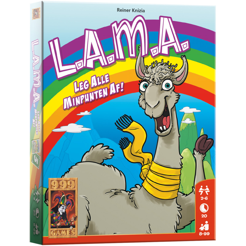 L.A.M.A. is een grappig, vlot en toegankelijk kaartspel met zeer eenvoudige spelregels! Het motto van L.A.M.A. is: Leg Alle Minpunten Af. Elke beurt probeer je kaarten af te leggen, anders krijg je er minpunten voor. Kun je niets afleggen, dan beslis je om te passen of een (hopelijk goede) kaart te trekken. Je krijgt minpunten in de vorm van fiches. Lukt het je om al je kaarten kwijt te raken, dan mag je een fiche teruggeven. En dat mag er één van waarde 1 of van waarde 10 zijn. Aan het einde wint de speler met de minste minpunten!