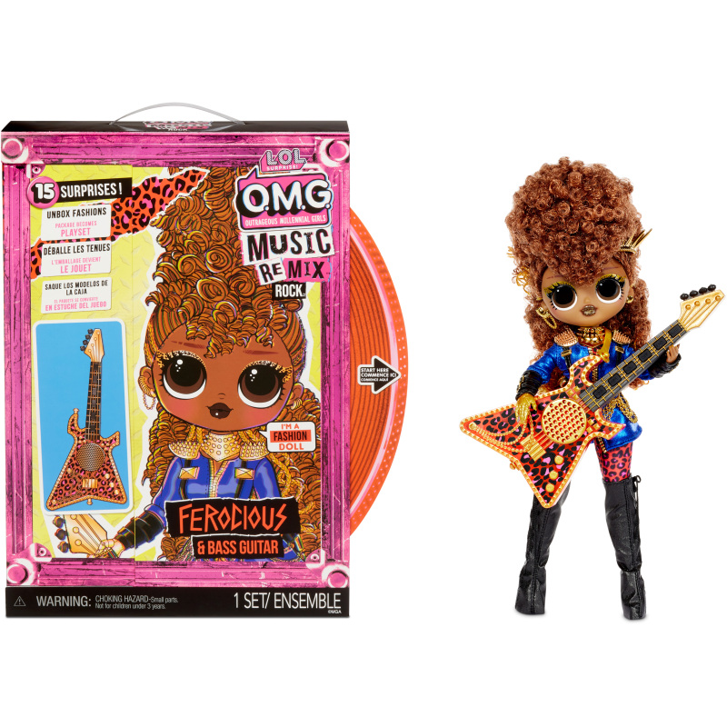 Heb je de Super Surprise Super Sonix de eerste keer gemist? Nu kun je ze afzonderlijk kopen! Maak kennis met de L.O.L. Surprise! Remix Rock OMG-modepoppen – O.M.G! Deze rebellen van de runway komen om te stralen! Pak de LOL Surprise OMG Remix Rock-modepop Ferocious uit met 15 verrassingen, inclusief instrument. Ferocious is lid van Super Sonix, de beroemde rockband van de hit ‘I’m a Queen’. Ze heeft een verbluffend mooi gezichtje, prachtig, gestyled haar en haar eigen, in het oog springende rocksterstijl. Ze is de grote zus van het populaire L.O.L. Surprise!-personage Fierce en klaar voor het ultieme concert. Pak de grammofoonplaat op ware grootte uit en speel hem af op haar platenspelerverpakking. Bereid haar daarna voor op de show. Ferocious heeft een extravagante modelook en muziekaccessoires, zodat ze helemaal klaar is voor het concert. Zet haar in een fotogenieke pose op de inbegrepen poppenstandaard om met haar te pronken. Ook inbegrepen is een tijdschrift met de tekst voor haar deel van de song. Verzamel alle songteksten van de hele reeks om de hele song te ontdekken. Of mix en match songteksten om je eigen remix te creëren. Bij elke LOL Surprise OMG Remix Rock is het volgende inbegrepen: een modepop, een fashionoutfit, 1 paar schoenen, een schoenendoos, accessoires, hoedendoos, haarborstel, poppenstandaard, grammofoonplaat op ware grootte, tijdschrift met songteksten en een verpakking waar je echt muziek op kunt afspelen. Verzamel alle 4 de L.O.L. Surprise! OMG Remix Rock-modepoppen! Zoals Ferocious zegt in de song ‘Rebels of the Runway’: “Click! Pose! We make a scene and rock the look.”
