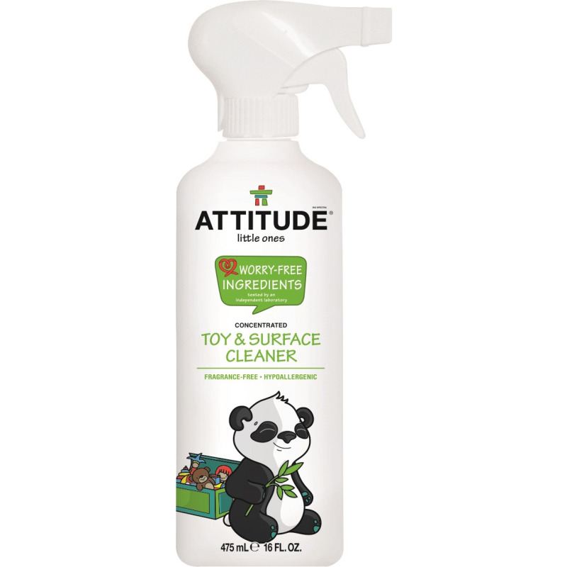 Reinig veilig en gemakkelijk speelgoed en andere oppervlakken in huis. De speelgoed en oppervlaktereiniger spray van Attitude is veilig voor het hele gezin, is geurvrij en hypoallergeen. Eenvoudige reiniging voor elk type oppervlak: inox, hout, emaille, geverfde of gelamineerde oppervlakken, afzuigkappen, glad, etc. Veilig voor het hele gezin Hypoallergeen Alle oppervlaktereinigers zijn vrij van enzymen om het risico op allergieën te verminderen Geurvrij Krachtige ontvettende eigenschappen Geen strepen op vloeren of glazen oppervlakken Geen glycolethers of chloor Geen dierlijke ingrediënten, zoals talg (vetten) Goed ergonomisch ontwerp met afsluitbare sproeikoppen Zonder fosfaten Minimale impact op het waterleven