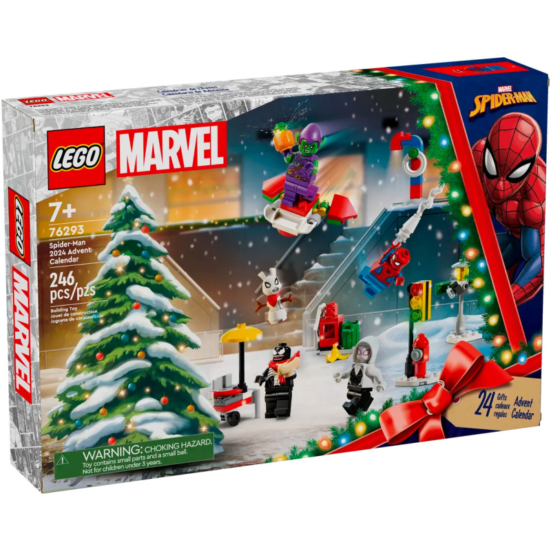 Geef een jonge Marvel fan een geweldig begin van de feestdagen met de LEGO® Spider-Man adventkalender 2024 (76293). Deze set zit boordevol superheldenplezier, bouwbare modellen en LEGO® Marvel Spider-Man minifiguren. Het is het ideale decembercadeau voor jongens en meisjes vanaf 7 jaar. Het plezier begint op 1 december en gaat door tot lang nadat het laatste vakje is geopend! Achter elk van de 24 vakjes vind je een cadeautje dat kinderen tijdens de aanloop naar Kerstmis kunnen ontdekken. Er zijn 5 minifiguren – Spider-Man, Green Goblin, Miles Morales, Ghost-Spider en Venom – plus klein bouwspeelgoed en accessoires die kinderen zullen herkennen uit de Spider-Man films. Deze omvatten een besneeuwde Spider-Ham, het bureau van Peter Parker en de winterboom van Electro. Er zijn ook 2 kleine auto’s waarmee je tegen elkaar kunt racen en een Sandman katapult die cadeautjes gooit! Naarmate de kerstdagen dichterbij komen, kunnen kinderen de cadeautjes combineren om hun eigen avonturen te creëren.