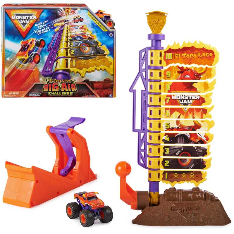 Bereid je voor op de ultieme Monster Jam stuntuitdaging: El Toro Loco’s Big Air Challenge. Wie kan de hoogste hindernis nemen om het overwinningsvuurwerk te activeren? De actievolle speelset is meer dan 50 cm hoog en bevat een originele El Toro Loco Monster Jam-Truck (schaal 1:64), een lanceerkatapult voor adembenemende sprongen en een Big Air Challenge toren. De toren is tot in detail gemodelleerd naar het origineel uit de stadionshow en kan als speelset onder vijf verschillende hoeken worden geplaatst, van verticaal tot helemaal plat. Hiermee kun je El Toro Loco laten meedoen aan hoge of lange sprongen. En natuurlijk past de set ook op alle andere Monster Jam trucks op schaal 1:64 (apart verkrijgbaar). Wie met zijn truck door de hoogste torenhindernis springt, laat een cool (mechanisch) vuurwerk afgaan – net als bij het live-evenement. Laat El Toro Loco hoog vliegen met kick-ass Monster Jam actie en de El Toro Loco’s Big Air Challenge speelset.