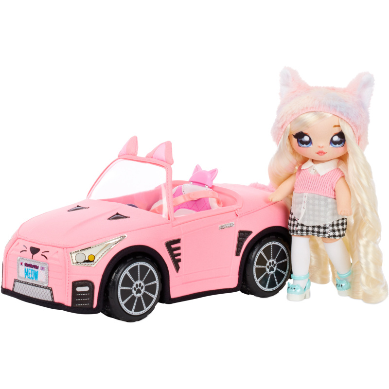 De Na! Na! Na! Surprise Plush Convertible is gemaakt van een zachte stof en voorzien van prachtige gestikte en glamoureuze zilveren details. Zo heeft de Soft Plush Cabrio schattige katten details, waaronder een snoezige neus en snorharen, oren op de voorruit en een zachte, pluizige staart. Maar ook alle herkenbare details van een echte auto. Zoals pluche stoelen, wielen die echt rollen, een MEOW nummerplaat en een bijpassend stuur. Dus rij weg op een wild avontuur met dit zachte, pluche voertuig. Het voertuig is geschikt voor één Na! Na! Na! Surprise pop (niet inbegrepen)