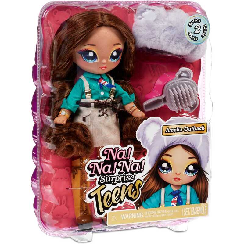 Welkom! Pluche en glamour horen bij onze manier van leven. We hebben een zwak voor mooie mode, dus we zien er altijd perfect uit, of we nou chillen met onze vrienden en vriendinnen of over de pluizige loper lopen. Wij zijn wild op stijl. Na Na Na Surprise Teens zijn prachtige, zachte modepoppen van 28 cm met heel veel persoonlijkheid en een glamourstijl. Amelia Outback heeft zich voor haar look laten inspireren door een koala. Ze heeft lang, bruin haar, een geprint gezichtje en geprinte kledingdetails. Ze is verpakt in een nieuwe doos met raampje, zodat je haar hoogwaardige details goed kunt zien. Ze draagt een mooie, pluizige muts met koalaoren, een sjaaltje met de Britse vlag erop en schattige, kniehoge laarzen. Het perfecte cadeau! Er zit ook een label bij met haar naam, verjaardag en een verhaaltje over haar erop. Verzamel alle 5 de supermooie, zachte Teens-modepoppen.