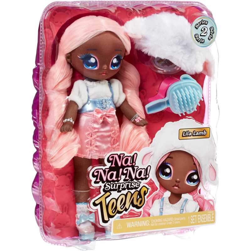 Welkom! Pluche en glamour horen bij onze manier van leven. We hebben een zwak voor mooie mode, dus we zien er altijd perfect uit, of we nou chillen met onze vrienden en vriendinnen of over de pluizige loper lopen. Wij zijn wild op stijl. Na Na Na Surprise Teens zijn prachtige, zachte modepoppen van 28 cm met heel veel persoonlijkheid en een glamourstijl. Lila Lamb heeft zich voor haar look laten inspireren door een schaap. Ze heeft lang, roze haar, een geprint gezichtje en geprinte kledingdetails. Ze is verpakt in een nieuwe doos met raampje, zodat je haar hoogwaardige details goed kunt zien. Ze draagt een pluizige muts en elegante hoge hakken. Het perfecte cadeau! Er zit ook een label bij met haar naam, verjaardag en een verhaaltje over haar erop. Verzamel alle 5 de supermooie, zachte Teens-modepoppen.