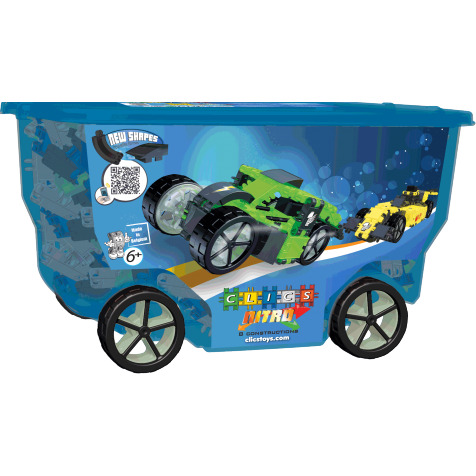 Met de Nitro rollerbox maak je wat je zelf wilt. Hou je van racewagens? Dan bouw je toch gewoon een supercoole bolide! Of zie je het groter? Waarom dan geen bus of truck maken? Er zit zelfs een echte schans en een finishlijn in de doos! Laat je fantasie de vrije loop! Alles is mogelijk! De Nitro rollerbox bevat maar liefst 356 Clics, 44 accessoires, stickers en bouwplannen voor acht verschillende constructies. Neem de wielen van de rollerbox en gebruik ze in je Nitro constructies. Bouw ze allemaal!Waarschuwing: dit speelgoed is niet geschikt voor kinderen onder de drie jaar i.v.m. kleine onderdelen.