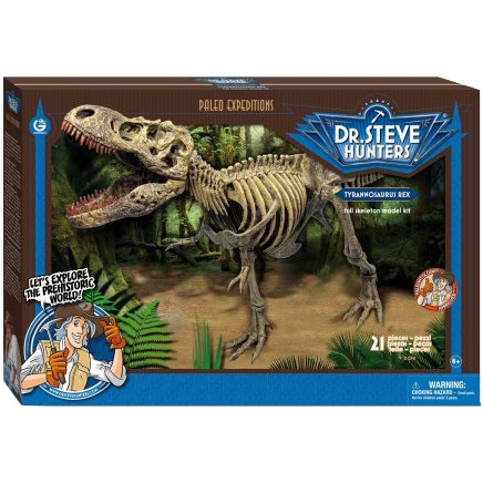 T-Rex, Velociraptor en Triceratops, de dinosaurussen die het meest geliefd zijn bij kinderen over de hele wereld! Assembleer de stukken voor een realistische replica van het skelet. Inbegrepen in de doos: een geïllustreerde poster voor eenvoudige montage en educatieve gids voor meer informatie over T-Rex, een Dr. Steve Comic en een certificaat van deelname met de naam van het kind.