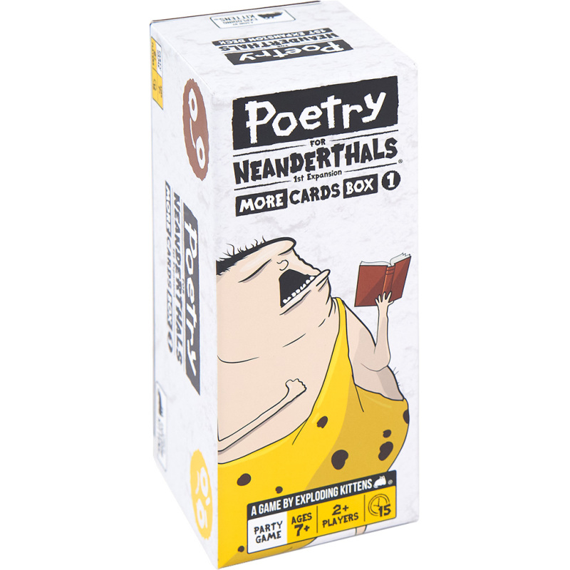 In het Poetry for Neanderthals Expansion More Cards Box 1 zijn er 500 kaarten met wel 2000 nieuwe woorden en zinnen om Poetry for Neanderthals te spelen. Poetry for Neanderthals is een partyspel voor alle leeftijden waar spelers punten winnen door hun teamgenoten woorden en zinnen te doen raden. Je mag hiervoor echter enkel woorden van een enkele lettergreep gebruiken. Langere, moeilijke woorden zullen bestraft worden met meppen met een opblaasbare knots door de tegenstander.