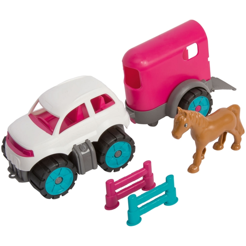 De BIG Power Worker mini ponytransporter is ideaal speelgoed voor de allerkleinste paardenliefhebbers. Deze robuuste speelset bestaat uit een SUV, aanhanger, pony en twee hindernissen. Het ontwerp van de onderdelen is speciaal aangepast aan kleine kinderhanden, zodat alles eenvoudig kan worden vastgepakt. De grote SUV heeft daarnaast brede banden van zachter kunststof, waardoor deze gemakkelijk te reinigen zijn, geen strepen achterlaten en een perfecte grip verzekeren. In de mooie roze aanhanger, die kan worden losgekoppeld, is voldoende plaats voor de pony. Geschikt voor kinderen vanaf 2 jaar.