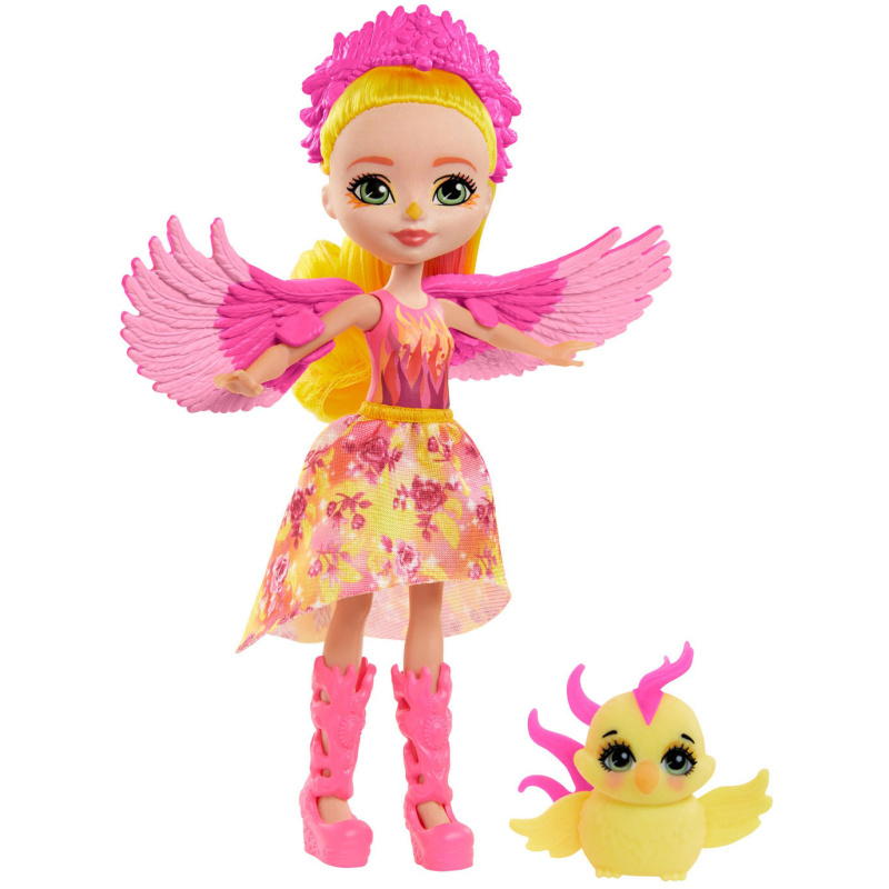 Maak kennis met de Enchantimals, een clubje leuke meiden die een speciale band hebben met hun beste dierenvriendjes! Falon Feniks (pop van 15 cm) en haar dierenvriendje Sunrise uit de collectie Royal Enchantimals zijn altijd samen en lijken zelfs op elkaar. Kleintjes zijn dol op Falon Feniks met haar vurige lange haar en glanzende vleugels. Ze draagt een kroon, een rok die aan en uit kan, en trendy schoenen. Falon en Sunrise hebben dezelfde leuke details die de fantasie prikkelen! Kinderen vinden het heerlijk om met deze speciale vriendjes te spelen.