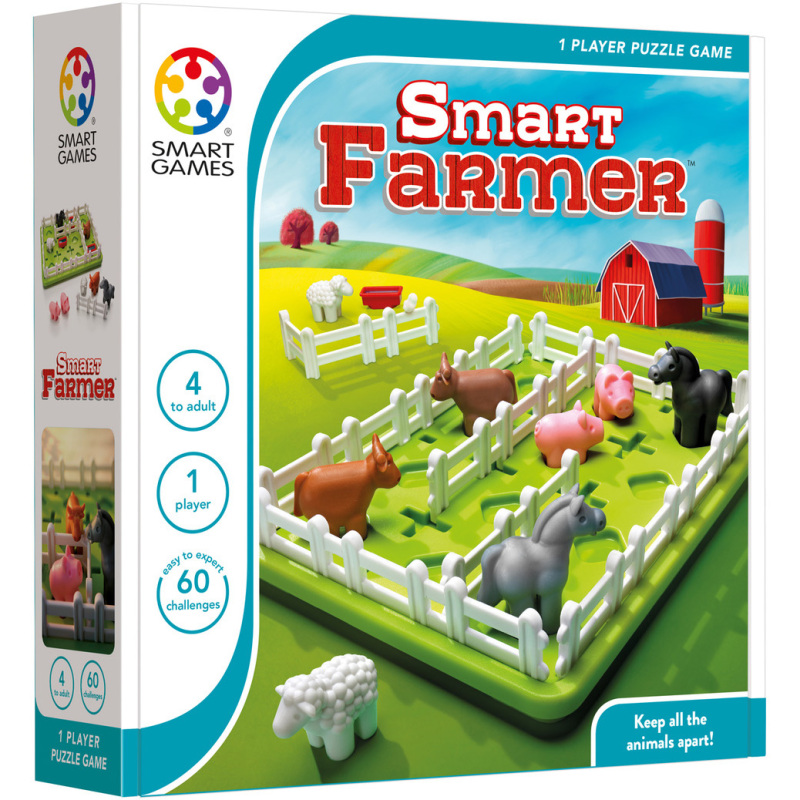 Het is een beestenboel op de Smart Farmer boerderij van SmartGames. De dieren maken er bende van en moeten van elkaar gescheiden worden… maar de boer heeft maar drie eenvoudige hekken om zijn land te verdelen in aparte weides. Kan jij hem helpen om de hekken op de juiste plaats te zetten, zodat de paarden, koeien, schapen en varkens hun eigen plek krijgen? Kan je er voor zorgen dat elk dier zijn eigen drinkbak heeft? Spelregels – Stap 1: Kies een opdracht. Plaats alles zoals op de afbeelding. – Stap 2: Verdeel met de hekken het spelbord in aparte weides. Paarden, koeien, schapen en varkens moeten elk een eigen weide krijgen. In moeilijke opdrachten moet elke weide zijn eigen drinkbak hebben.