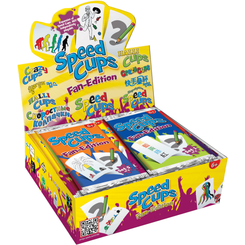 De speciale uitbreidingsset voor Speed Cups van 999 Games bestaat uit in totaal 30 verschillende kaarten, die je door de kaarten van het basisspel Speed Cups en/of Speed Cups 2 kunt schudden. De kaarten zijn echter over 6 pakjes van 5 verdeeld, zodat je ervoor kunt kiezen om slechts een deel van de uitbreidingsset aan te schaffen of alle 30 kaarten. De kaarten zijn niet willekeurig gesorteerd, dus bij aankoop van 6 verschillende pakjes heb je de set compleet! De kaarten in deze set zijn ontworpen door Speed Cup-fans. Een jury heeft naar aanleiding van een ontwerpwedstrijd in 2015 de 2 beste inzendingen van elk deelnemend land beloond met een exemplaar in deze uitbreidingsset. Met de Speed Cups Fan-editie wordt Speed Cups nog leuker!