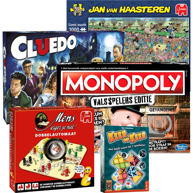 Dit spellenpakket levert extra veel speelplezier op en bestaat uit: het 999 Games Keer op Keer Dobbelspel, het Hasbro Cluedo Bordspel, het Hasbro Monopoly – Valsspelers Editie Bordspel, het Jumbo Mens Erger Je Niet! Dobbelautomaat Bordspel en de Jumbo Jan van Haasteren – Oud Hollandse Ambachten Puzzel. 999 Games Keer op Keer Dobbelspel Dobbel- en puzzelspel voor het hele gezin met Keer op Keer van 999 Games. Kruis vakjes op je speelveld aan om zo snel mogelijk kolommen en gelijkgekleurde gebieden te vullen. Elke beurt kies je een gedobbelde kleur en een gedobbeld cijfer. Die combineer je, waardoor je aangrenzende vakjes van de gekozen kleur mag aankruisen. Maak steeds de juiste keuze en probeer de door de andere spelers gewenste combinatie weg te nemen. Je keuzemogelijkheden stijgen als je je speelveld verstandig uitbreidt. Naast punten voor complete kolommen krijg je ook een bonus als je alle vakjes van één kleur hebt aangekruist. Het spel is afgelopen als een speler twee complete kleuren heeft aangekruist. Wie heeft de meeste punten? Hasbro Cluedo Bordspel Er is een moord gepleegd en er zijn zes verdachten. Wie lukt het als eerste om de moord op te lossen? Om dit bekende misdaadspel te winnen, moet je drie dingen achterhalen: wie heeft het gedaan? met welk wapen? en waar is de moord gepleegd? Start je onderzoek en bekijk de verdachten, wapens en kamers. Was het Pimpel met het pistool in de badkamer? Of Groenewoud met de dolk in de keuken? Sluit de mogelijkheden uit en beschuldig een verdachte. Als jij als eerste de juiste dader, wapen en plaats hebt achterhaald, ben je de winnaar van het spel. Hasbro Monopoly – Valsspelers Editie Bordspel Deze ontzettend eigenzinnige versie van Monopoly haal je als eerste tevoorschijn op gezellige (spelletjes)avonden. Beleef legendarische (maar onuitgesproken) Monopoly-momenten met de Monopoly Valsspelers Editie waarop regels krom zijn, geld wordt geleend en vals spelen wordt toegejuicht. Het bijzondere bord, de aparte aanwijzingen op de kaartjes en de rare regels halen de bedrieger in elke speler naar boven. Ga voor het grote geld en beduvel de boel op slinkse wijze bij elke koop of verkoop. Doe een nepgooi met de dobbelsteen, steel wat flappen van de bank en sla de huur een keertje over. Volbreng een valsspeelopdracht en krijg een beloning. Luk dit niet, dan moet je op de blaren zitten! In deze editie zijn er geen huizen, alleen hotels. De handboei houdt spelers in de gevangenis gekluisterd aan het bord. Jumbo Mens Erger Je Niet! Dobbelautomaat Bordspel Mens Erger Je Niet! Dobbelautomaat van Jumbo is een variant op het klassieke Mens Erger Je Niet!-spel met een handige dobbelautomaat. Druk op de dobbelautomaat en de dobbelsteen gaat rollen. Door de dubbelautomaat kan de dobbelsteen in deze luxe uitvoering niet meer wegrollen. Ook kunnen door de verhoogde spelvakjes de pionnen niet meer per ongeluk verschuiven. Jumbo Jan van Haasteren – Oud Hollandse Ambachten Puzzel In deze Jan van Haasteren Oud Hollandse Ambachten 1000-stukjespuzzel, bezoekt de Jan van Haasteren familie de Oud Hollandse Ambachtenmarkt om te zien hoe het was in grootmoeders tijd. Zij kunnen een glas-in-lood workshop volgen, klompen maken, beeldhouwen, deelnemen aan ringsteken, en nog veel meer! Maar is schoonmoeder blij met het resultaat van de beeldhouwles? Of komt het pijnlijk dicht bij de werkelijkheid? Deze plaat is getekend door Dick Heins.