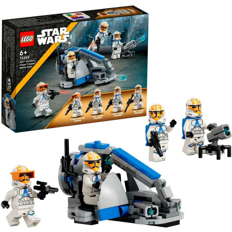 Kinderen kunnen Star Wars: The Clone Wars scènes en hun eigen missies naspelen met het 332nd Ahsoka’s Clone Trooper Battle Pack (75359). De set bevat 4 LEGO® Star Wars™ minifiguren: een LEGO minifiguur van Clone Captain Vaughn die nieuw is vanaf augustus 2023 met een speciale helm en 3 332nd Clone Troopers, plus een blastergeweer, 3 blasters en 2 jetpackaccessoires. Deze bouwbare speelset is een geweldig cadeau-idee voor Star Wars: The Clone Wars fans van 6 jaar en ouder bevat ook een Clone Infantry Support Speeder voertuig met 2 noppenschieters en zitplaatsen voor 2 LEGO minifiguren, plus een noppenschietend laserkanon. Een nieuwe manier van bouwen Bekijk de LEGO Builder app voor digitale instructies en zoom- en draaifuncties om de creatieve ervaring nog leuker te maken. Een sterrenstelsel vol plezier De LEGO Groep maakt al sinds 1999 ruimteschepen, voertuigen, locaties en personages uit het Star Wars universum na. Er zijn diverse sets verkrijgbaar voor fans van alle leeftijden.