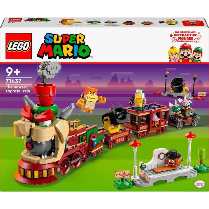 Maak je op voor een wilde rit met deze LEGO® Super Mario™ De Bowser Exprestrein speelgoedset (71437). Deze avontuurlijke speelset voor kinderen is een geweldig Nintendo® cadeau voor jongens, meisjes en gamers vanaf 9 jaar en bevat een gedetailleerde trein, een lorrie, 2 stations, een supersterblok, een ?-blok en 6 LEGO Super Mario speelgoedfiguren: een Hammer Bro, Boom Boom, 2 Goomba’s en 2 Para-Biddybuds. Voeg een LEGO® Mario™, LEGO® Luigi™ of LEGO® Peach™ figuur toe (niet inbegrepen) voor interactief speelplezier. Help ze de trein te achtervolgen in de lorrie, het draaiende platform op de locomotief te bedienen en het kanon te activeren. Als al je tegenstanders zijn verslagen, klinkt er een toeter terwijl je met de Bowser Exprestrein naar het station rijdt. Je vindt de bouwinstructies in de doos of in de LEGO Super Mario app, die ook creatieve ideeën bevat voor verschillende manieren om te bouwen en te spelen met deze Nintendo verzamelset.