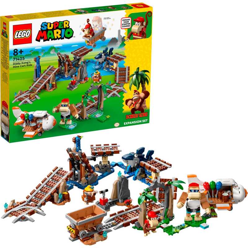 Creëer een spannend Donkey Kong™ level in je eigen LEGO® Super Mario™ universum met deze Uitbreidingsset: Diddy Kongs mijnwagenrit (71425). Plaats een LEGO® Mario™, LEGO® Luigi™ of LEGO® Peach™ figuur (niet inbegrepen) in het mijnkarretje om over de baan te rijden. Gooi de Snaggles aan de kant, repareer de kapotte baan, versla de mijnmol en laat de rots ‘ontploffen’ om een tros bananen te onthullen om te ‘eten’ of cadeau te geven aan Funky Kong of Diddy Kong. Koop ballonnen in de vliegtuigwinkel en ‘vlieg’ in het vliegtuig om meer digitale munten te verdienen. Let op: je hebt de startset 71360, 71387 of 71403 nodig. Bouwen met behulp van een app Download de LEGO Super Mario app voor de bouwinstructies en tips voor een nog leukere creatieve ervaring. Ombouwen en combineren Dit is een superleuk cadeau voor kinderen vanaf 8 jaar en voor iedereen die van Donkey Kong houdt. De modulaire set kan worden gecombineerd met andere LEGO Super Mario speelsets om unieke levels te creëren.